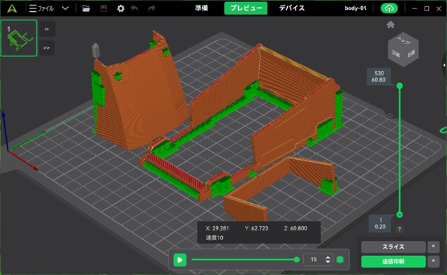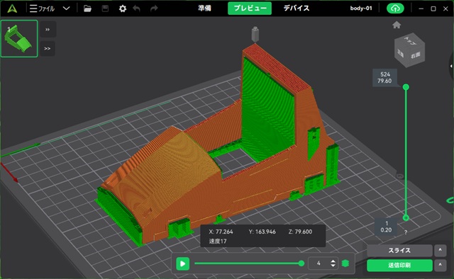 サポート材を追加してスライスしてみると、こんな感じでかなりサポート材のお世話になる形状でした。