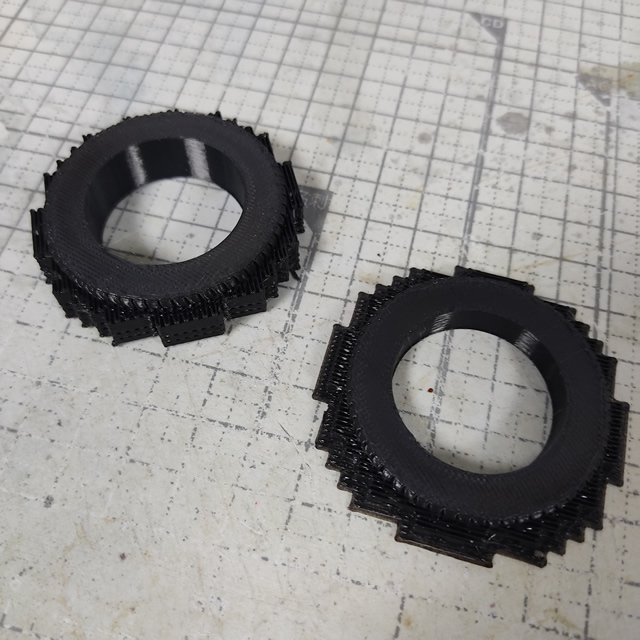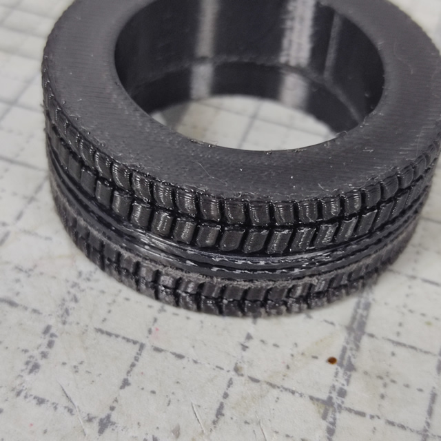 ということで、黒のPLAフィラメントでタイヤを造形。両端が上側を向くように、中央部分で2分割しました。