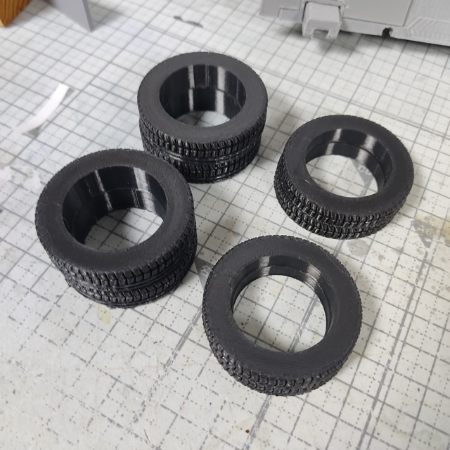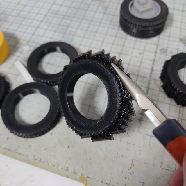 軽くバリ取りして4組のタイヤパーツの造形が完成しました。
