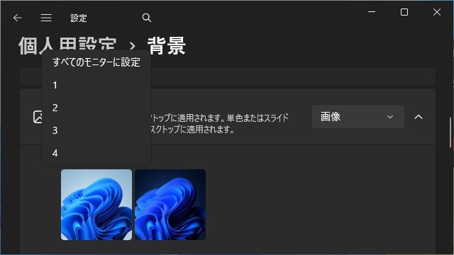 例えば、4つのモニターが接続されている場合[背景をカスタマイズ]画面の背景画像の履歴部分を右クリックして表示されるポップアップメニューに設定するモニターの番号が表示されます。