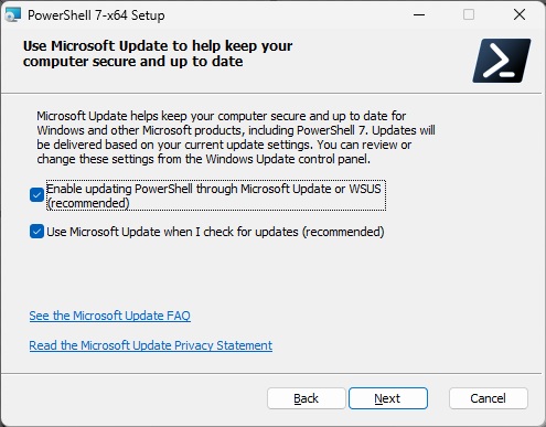 4.[Use Microsoft Update…]画面で更新時の挙動について設定を行い[Next]をクリックします。