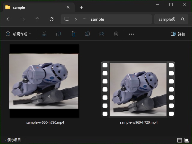 Windows エクスプローラーの仕様で、動画形式のファイルをアイコン表示した際にサムネイルが表示できるファイルには、左右に映写フィルムのようなフレームが表示されます。