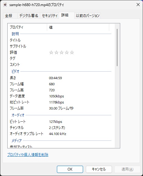 上の画像で右側のファイルのプロパティです。