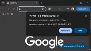 Google Chromeブラウザーでマイナポータルを利用する際に「マイナポータルが無効になりました。再度有効にするには次の新しい権限を許可してください。」[www.msc-ehime.jp 上にある自分のデータの読み取 … 続きを読む Google Chromeのマイナポータルがエラーで[msc-ehime.jp]の権限を求められる場合の対処法