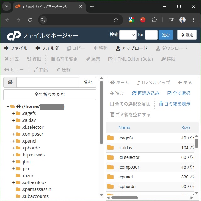 [cPanel]で提供されている[ファイルマネージャー]は[.](ピリオド)から始まる名前のフォルダーは既定値で隠しフォルダーとして表示されません。