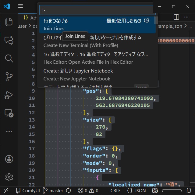 1. JSONコードをすべて選択した状態で[Ctrl+Shift+P]などでコマンドパレットを開きます。