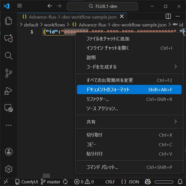 しかし、[ドキュメントのフォーマット]メニューではインデント付きのJSONファイルの内容を1行にはできません。