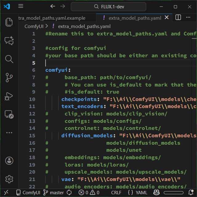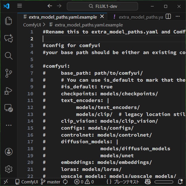 フォルダー内にサンプル用の[extra_model_paths.yaml.example]ファイルがあるので、これを流用してファイルを作成します。