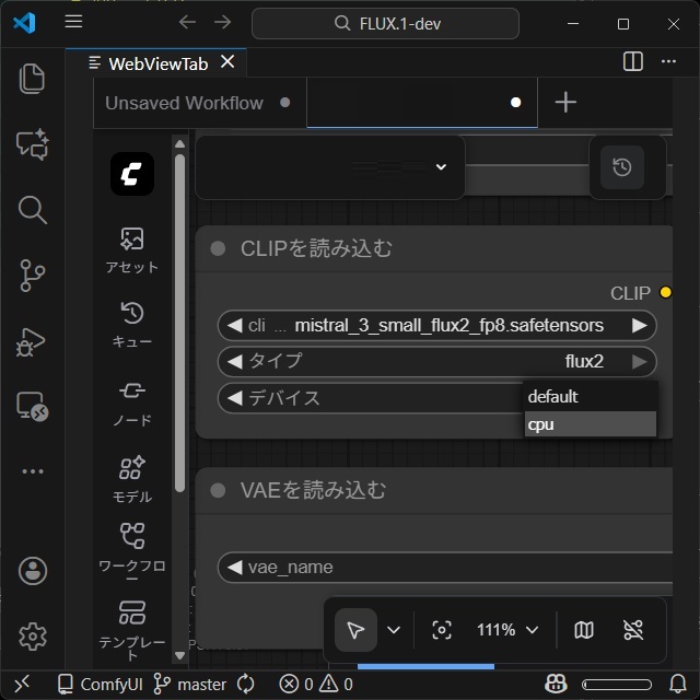 1.[CLIPを読み込む]ノードの[デバイス]をクリックして一覧から[cpu]を選択します。