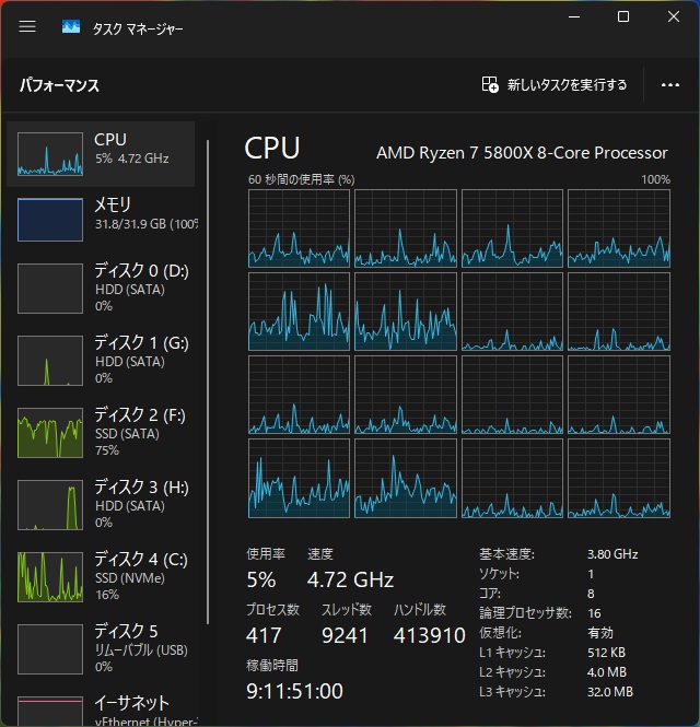 [CLIPを読み込む]ノードの[デバイス]を[cpu]に変更していますが、処理中の状態はこんな感じでした。