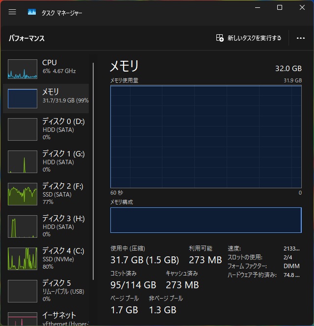 物理メモリは使い切った状態なので、テスト的な処理はできますが運用で使うイメージではありません。