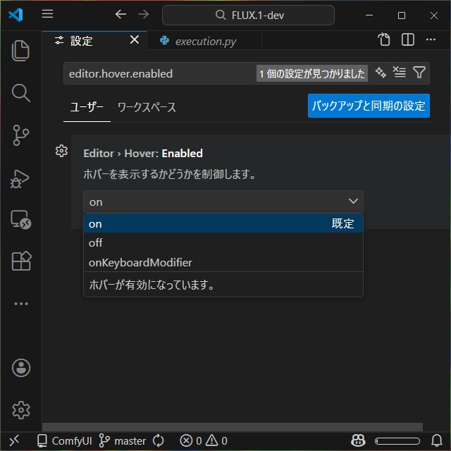 1.[設定]画面で “editor.hover.enabled” を検索します。