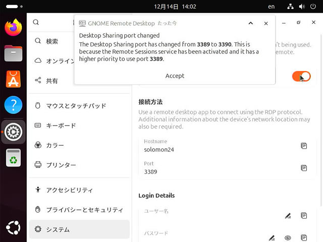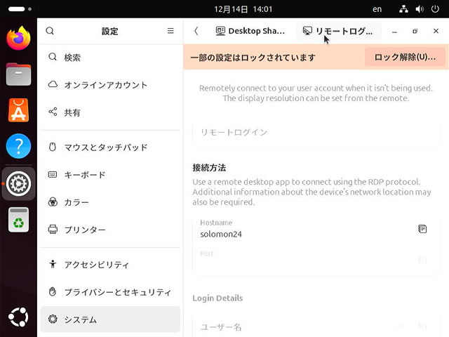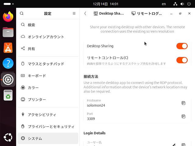 UbuntuにWindows11の[リモートデスクトップ接続]から接続したい場合には[リモートログイン]設定を行います。