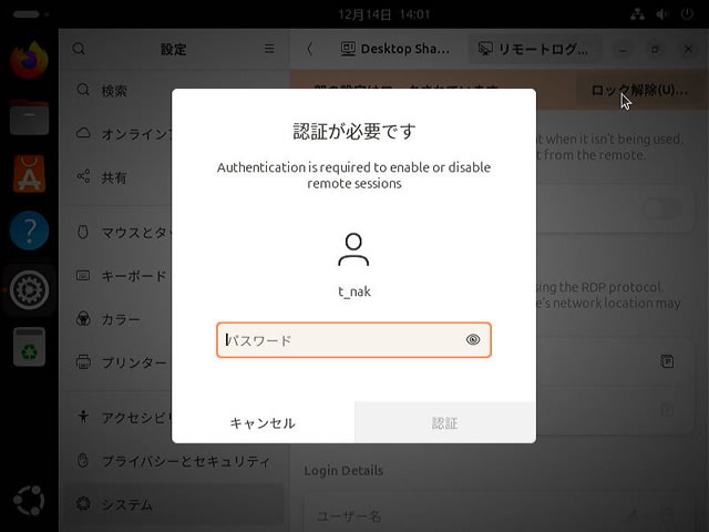 バージョン[22]では、接続先のUbuntuにログインしていないと接続できず、ロックされた場合は切断されてしまうなど
