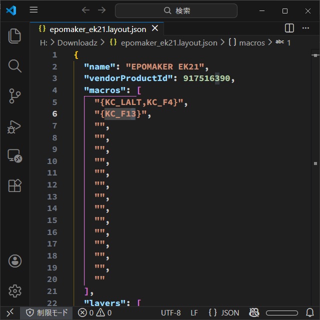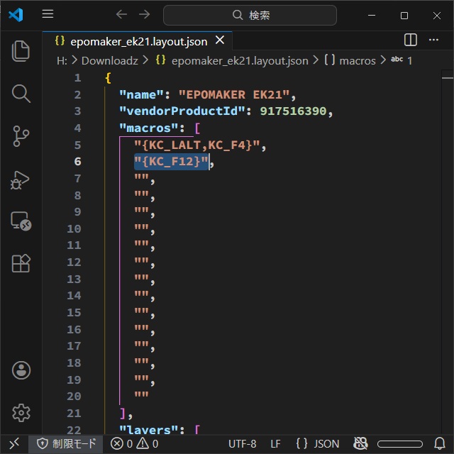 4. メモ帳などで保存したファイルを開き[”macros”]の行を見つけます。(次の行の上段から[M0]~[M15]に対応しています)
