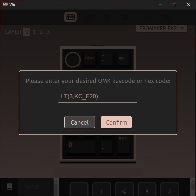 3. ポップアップした画面に “LT(3, KC_F20)” を入力します。