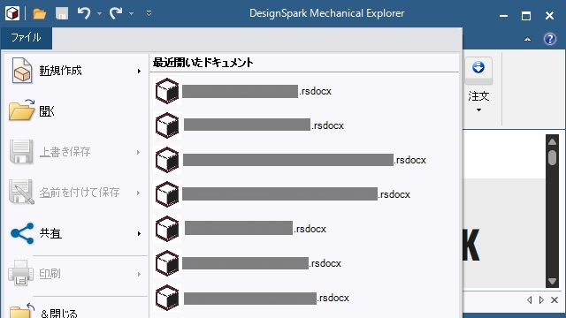 DesignSpark Mechanicalの[ファイル]メニューを表示すると、こんな感じで表示される場合があります。