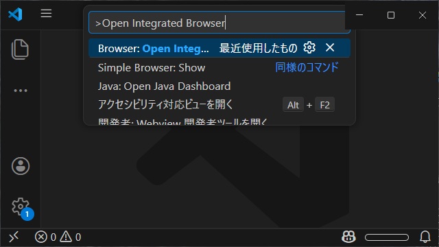 1. [Ctrl+Shift+P]で表示された[コマンド表示]画面で “Open Integrated Browser” を入力して選択します。