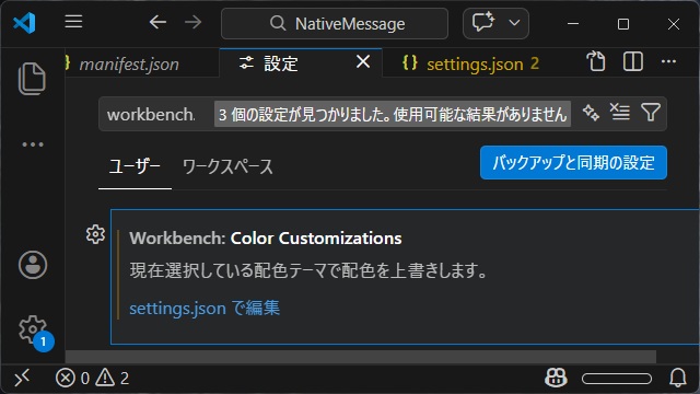 1.[設定]画面で “editorBracketMatch.foreground” を検索して表示された[Workbench: Color Customizations]の[settings.json で編集]リンクをクリックします。