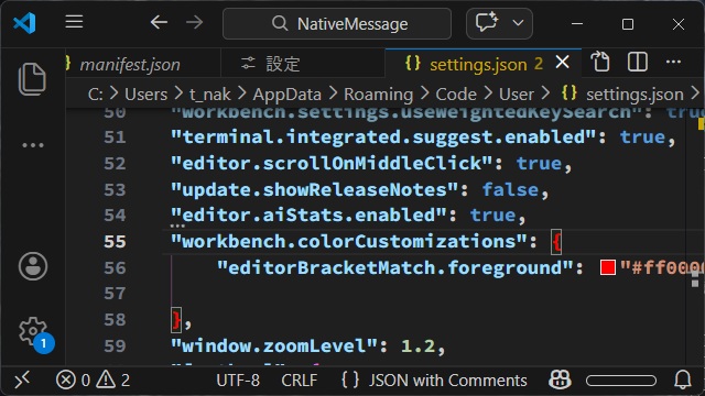 2. 表示された[settings.json]で[workbench.colorCustomizations]に editorBracketMatch.foreground: “#ff0000” を追加します。