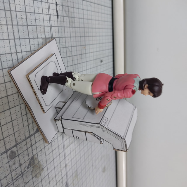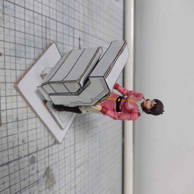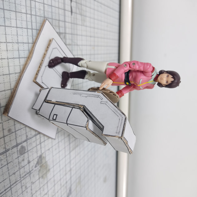 新しく発売された[G.M.G. COLLECTION 12 機動戦士ガンダム 地球連邦軍 ミライ・ヤシマ 可動フィギュア]を飾るための装飾としてホワイトベースの操縦ユニットを3Dプリントで造形してみます。今回は段ボールで試作したモックアップとフィギュアでサイズ確認しました。