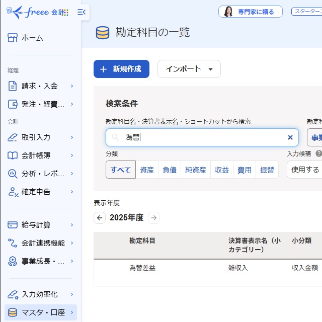 freeeのデフォルト設定では追加されていないケースが多いですが[為替差益]があります。何らかの事由で文字通り為替で利益が出た場合の勘定科目です。
