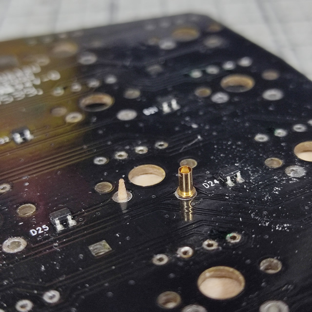 [Razer Orbweaver]が販売された当時は、キースイッチを直接ハンダ付けする前提の基盤なのでホットスワップ用のソケット金具を表面から通すことが出来ません。