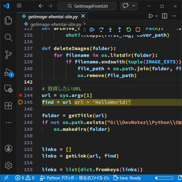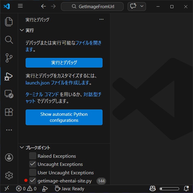 1. メインメニューの[実行とデバッグ](矢印に虫)アイコンをクリックします。