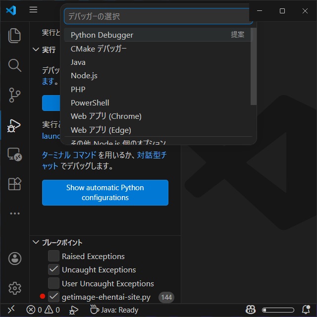 3.[デバッガーの選択]の一覧から利用するデバッガー(例[Python Debugger])を選択します。