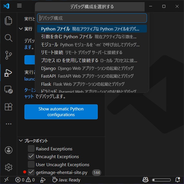 4.[デバッグ構成]の一覧からデバッグを行う構成(例[Python ファイル])を選択します。