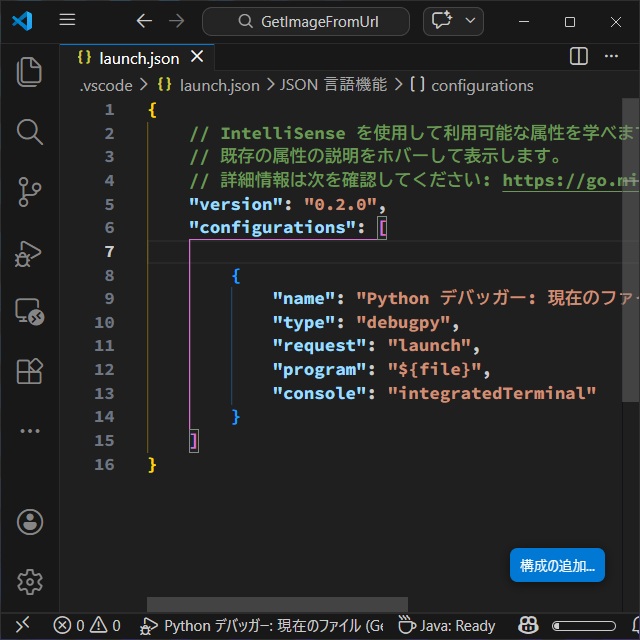 [launch.json]を追加するとデバッグ実行する際のカスタマイズが可能です。