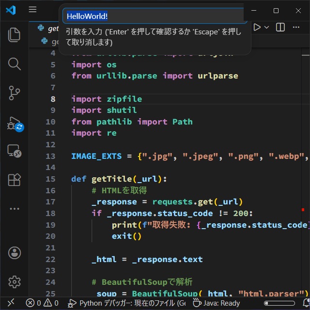 デバッグ実行すると、引数を入力するプロンプトが表示されます。