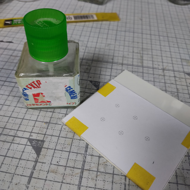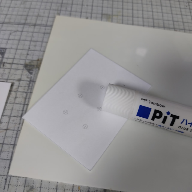 ガイドの固定は100均でも購入できるスティックのりを使います。今回はベース部分のパーツなので、1ミリ厚のプラ板を使いました。(カット後に2枚で積層して2ミリにします)