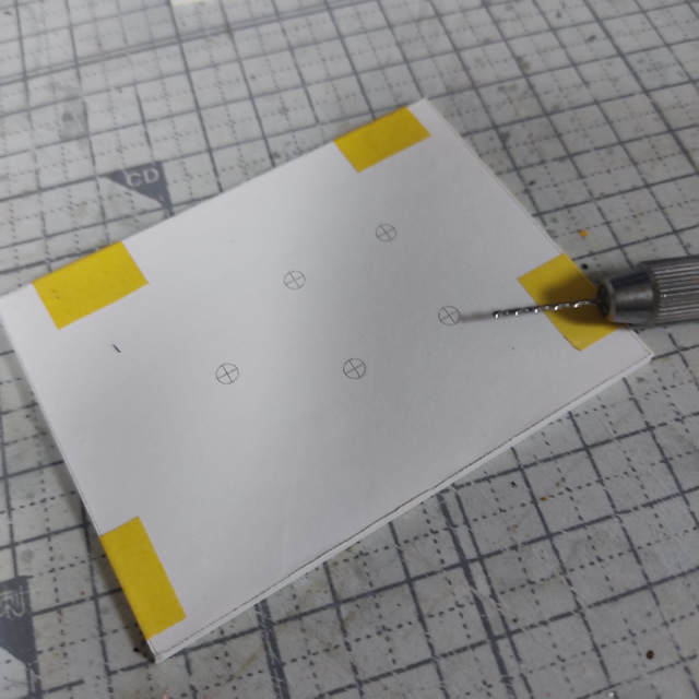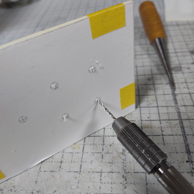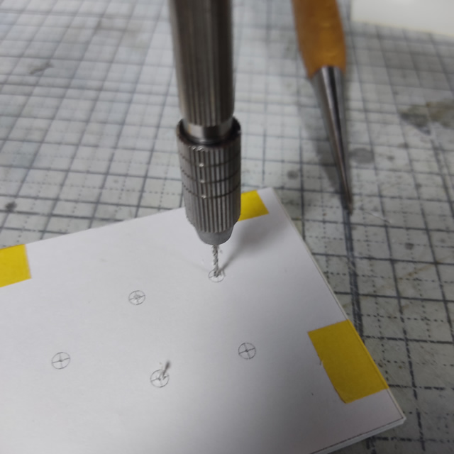 位置決めした凹みにピンバイスで下穴を開けます。