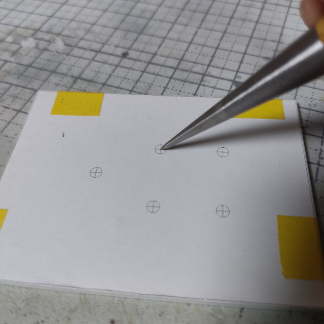 ガイドに付けた中心線に目打ちで位置決め用の凹みを作成。