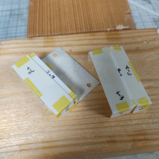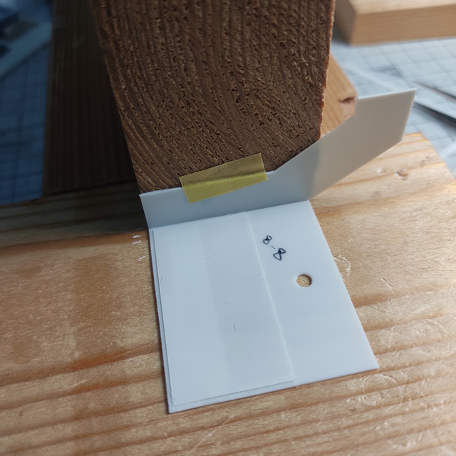 こんな感じで断面の組合せで90度を出します。木材が良いのは接着剤がパーツからはみ出しても木材ならパーツが治具に接着する心配がありません。