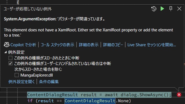 C# WinUI 3アプリを作っていく途中で、調べたことを忘録的に投稿します。今回はWinUI3プロジェクトで、ContentDialogを表示するShowAsyncメソッドを呼び出した際に “パラメーターが間違っています。” が発生する場合の対処法です。