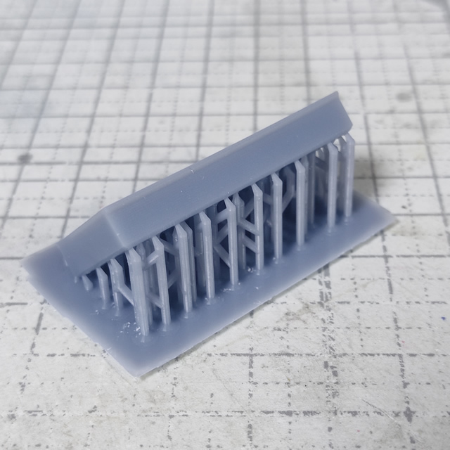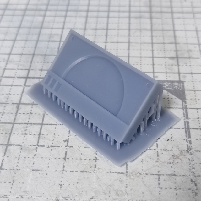 当初の設計ではプラ板と同じくらいの厚み(1ミリ)で造形しましたが実際に造形してみるとパーツの変形や固定方法に課題があるのが判明したのでデザインを修正しました。