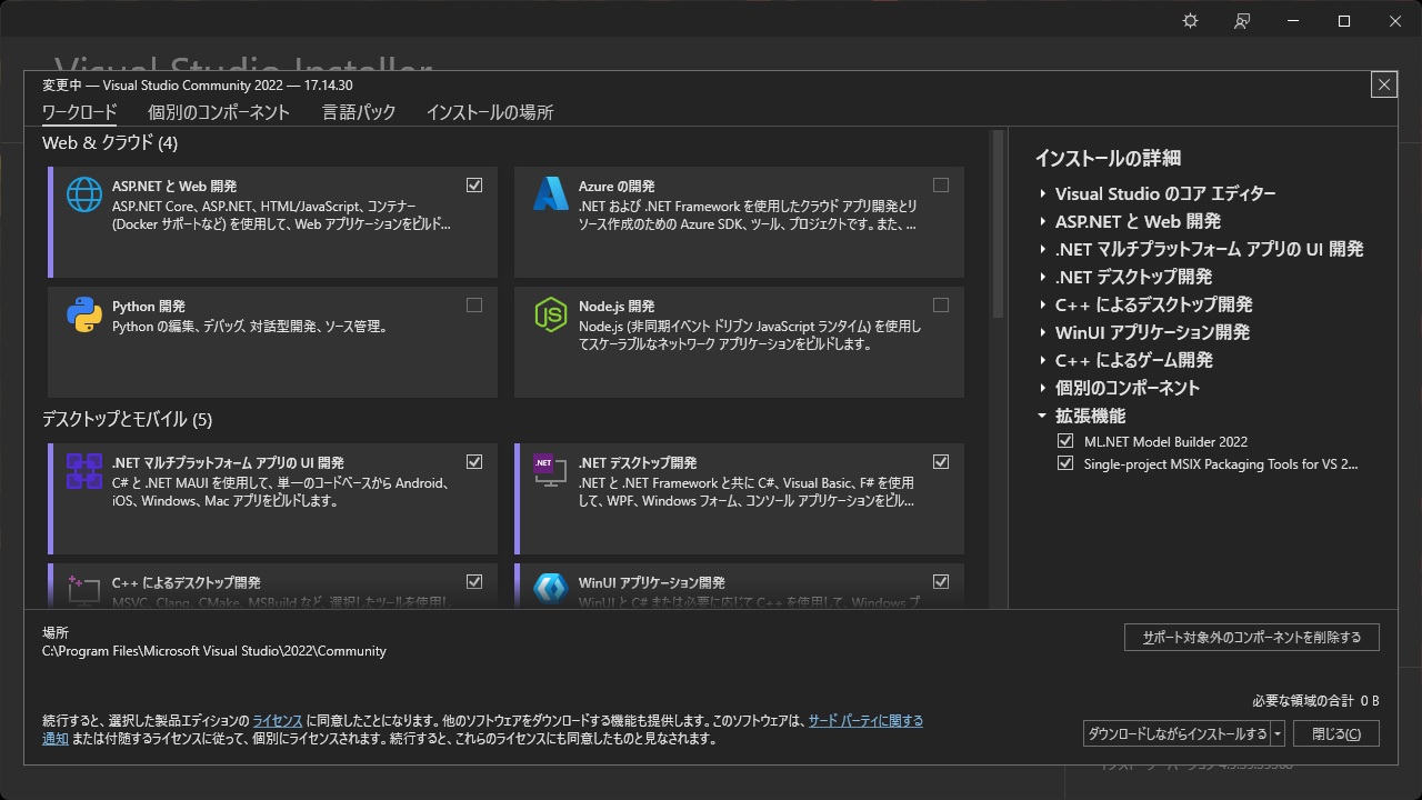 小手先で時間を費やすよりも[Visual Studio Installer]で、すべてのワークロードのチェックを外して、更新(つまりアンインストール)してから、ワークロードをインストールします。